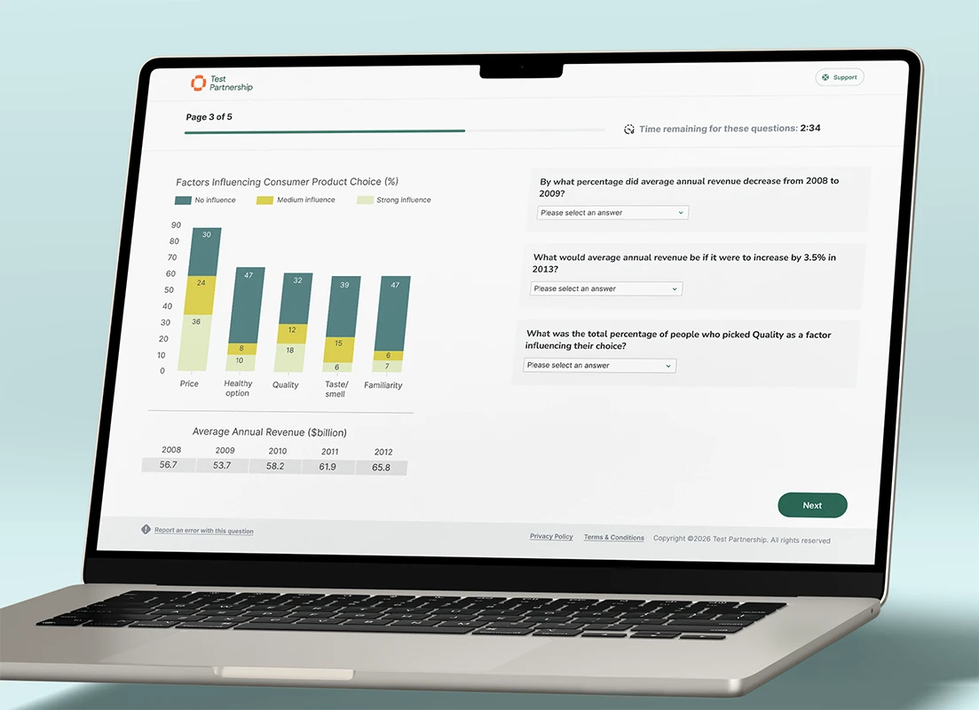This numerical reasoning assessment is designed to assess how candidates interpret, analyse, and reason with numerical data, and is built on robust assessment science that ensures accuracy and fairness behind the scenes.