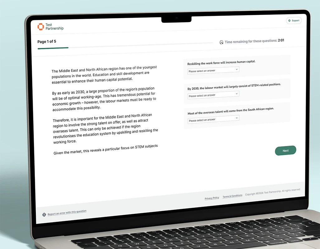 This verbal reasoning assessment is designed to assess how candidates interpret and reason with written information, and is built on robust assessment science that ensures accuracy and fairness behind the scenes.